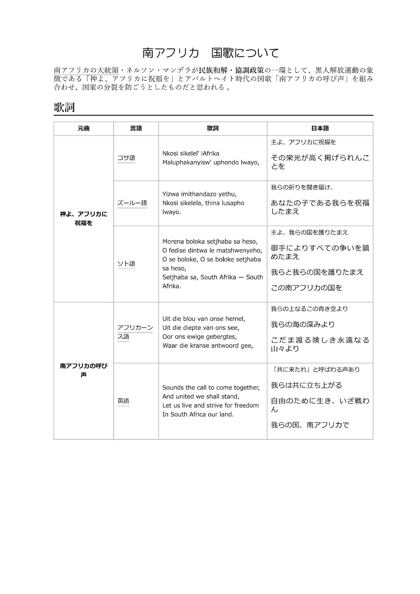 好きな讃美歌の一つに21-162番「見よ、兄弟が座っている。何という恵み、何という喜び」があります。詩篇133そのままが歌詞になっています。 わたしたちは普通、あの人たちは兄弟のように仲がいいとか、兄弟のように助け合っている、と言う風に言ったりしますが、兄弟のように仲が悪い、兄弟のようにいがみ合っている、という風には言いません。 聖書には兄弟の物語、例えがいくつもありますが、カインとアベルに始まって、イシュマエルとイサク、エサウとヤコブ、ヤコブの息子たち、ダビデの息子たちなど数え切れないほど仲の悪い兄弟が登場します。むしろ少数ですが、ダビデとヨナタンのように神を畏れる親友として兄弟以上のつながりを発見します。 さて、アダムはエバを知ったとあります。ヘブライ語でヤーダーという言葉ですが、神との親しい間柄や夫婦の性的な関係を意味します。エバは「わたしは主によって男の子を得た」と言い、子どもの誕生は神さまによるという理解があるわけで「カイン」と名付けました。「手に入れる」という意味です。ところがどうしたわけか次男には「アベル」という名前をつけました。これは「空しい、はかない」という意味です。わが子に「悪魔」という名をつけた親がいましたが、アニメの影響か、ふざけています。名付けには親の願いや愛情が込められますが、同時に親の環境や価値観が表れるのです。命名は人の一生を左右することがあります。 この物語の背景には農耕民族と遊牧民族の対立構造があるようですが物語をそのまま観察してみましょう。二人の年の差は分かりませんが、成長して働くようになり、カインは麦畑を、アベルは羊を飼うようになりました。カインは弟殺しによって人類最初の殺人者という汚名を着せられていますが、実際の成長として考えると、父親のアダムと一緒に土を耕す仕事を覚えていったことが記されています。 時を経てとあります。カインは種まきや収穫ができるまでになり麦の収穫の一部を神さまに献げました。よい息子です。今の時代は子どもは就職すると最初の給料から親にプレゼントをしたりしますが、神に献げ物をする家庭は少ないでしょう。神を知らないからです。アダムは神を失望させましたが、神を忘れたはずはありません。カインの献げる思いは父親譲りで貴いことです。 弟のアベルは羊を飼うようになりました。兄弟で性格や関心事が違うのはふつうのことです。弟は兄の働きを見ながら、いつか自分も神さまに献げものをしたいと思ったことでしょう。やがてその時が来ました。一生懸命世話した羊がまるまると育ったので、きっと神さまに喜んでもらえると思って献げました。 この二人の献げる行為は、素直で素晴らしいことでした。ところが、思いがけないことが起こりました。ある年、二人はそれぞれの献げ物を神の前に差し出しました。この時代、祭壇があったかどうか、どんな方法で献げたかは分かりません。「主はアベルとその献げ物には目を留められたが、カインの献げ物には目を留められなかった」のです。カインは自分が否定されたと思いました。その思いは弟への嫉妬、殺意を抱くまでになるのですが、主はカインの心の奥をご存じで「どうして怒るのか。どうして顔を伏せるのか。もしお前が正しいのならば顔を上げられるはずではないか」と頭を冷やすように促し「罪が待ち伏せし、お前を求めている」と悪の誘惑に打ち勝つように諭しました。 子どもが小さいときはこんな事があります。兄弟が親に何かを見せに来ました。親はまず、弟に目を丸くして関心を示し、喜んだり褒めたりします。兄はやきもきして待ちますが自分の番になりません。それで「ねえ、僕のも見てよ、僕の話も聞いてよ」とせがみますが親は「どれどれ見せてごらん」とは言いますが、明らかに弟の時のように関心を示しません。思うようにならなかったとき腹いせが他者に向かいます。弟にしてみれば、どうしてお兄ちゃんがいじめるのか分かりません。 神さまには深い深い思いがあって、兄と弟をちゃんと見ているのです。ルカ福音書の15章に、放蕩息子の喩えの話がありますが、どうしても弟の劇的な結末に関心が向けられますが、イエスさまはまじめな兄が父親から正当に評価されていることを忘れてはおられません。 私たちは、どうしても自分中心の理屈で出来事を受け止めてしまいます。ひどいと感じてしまうと、相手の考えや事情を想像することが出来なくなってしまいます。そうして、その人に最低のレッテルを貼ってしまうのです。 アンガーコントロールという方法があります。かっとなるような時は、数秒まって深呼吸してから行動するのです。単純なけんか回避の方法です。 さて、今日は南アフリカの国旗と国歌について少し紹介したいと思います。南アフリカ共和国にはアパルトヘイトという黒人隔離の制度が長く続きました。ご存じのように、世界には依然として肌の違